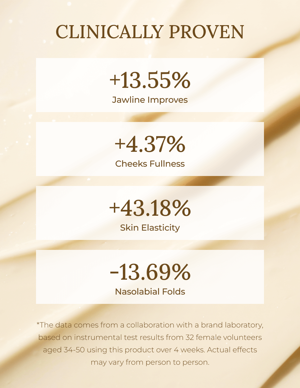 *The data comes from a collaboration with a brand laboratory, based on instrumental test results from 32 female volunteers aged 34-50 using this product over 4 weeks. Actual effects may vary from person to person.