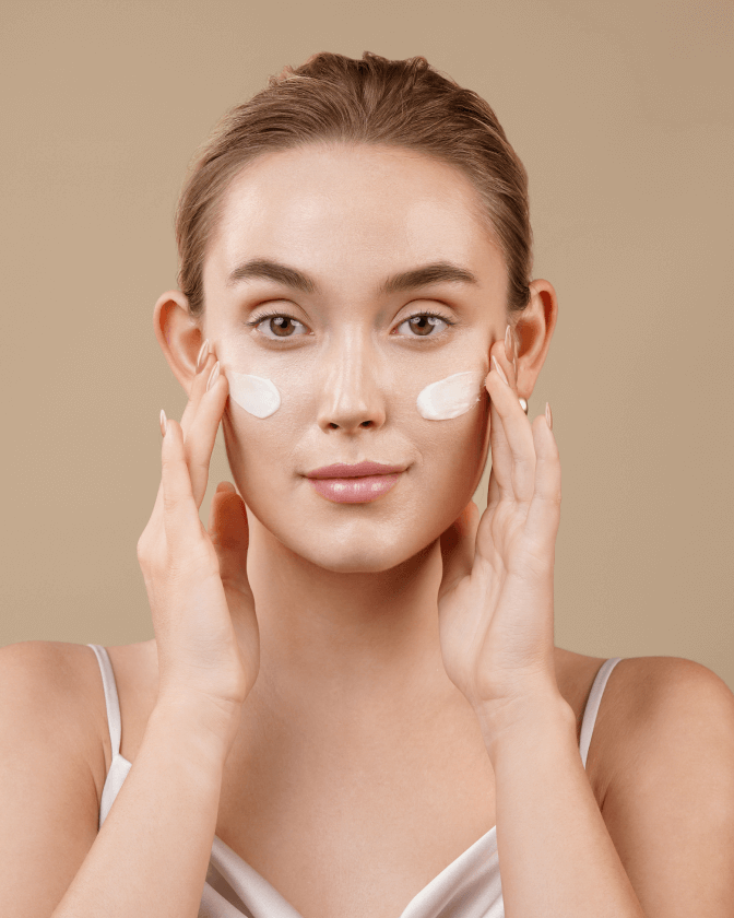 Dab the cream on the cheeks, forehead, and jowls, then spread evenly over the face and neck in an inside-out direction.