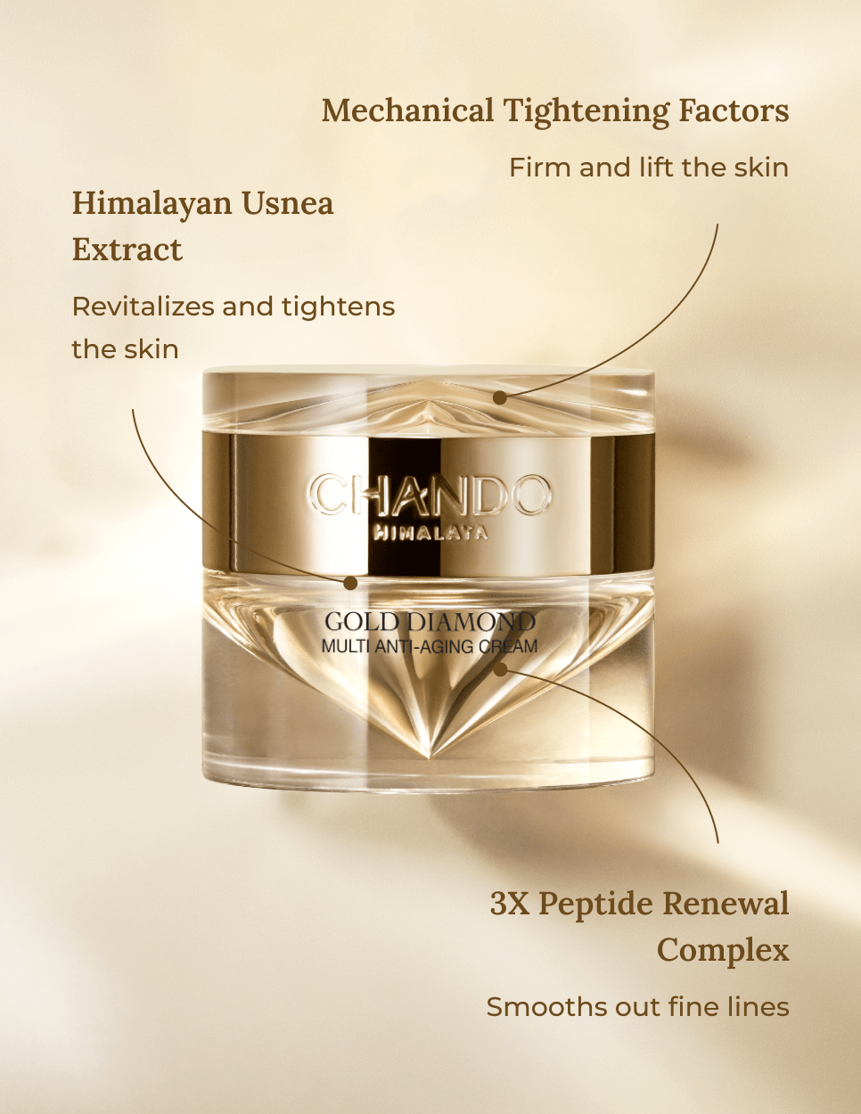 Achieve precise contouring and firming. The CHANDO HIMALAYA Gold Diamond Multi Anti-aging Cream is formulated to improve skin elasticity, reduce fine lines, and lift the skin. Infused with HiMurchaSin™ Himalayan Yeast that is sourced from extreme altitudes, it supercharges your skin’s natural renewal process by up to 591.7%, unveiling a firmer and more radiant complexion. Combines the benefits of Himalayan Usnea extract, 3X Peptide Renewal Complex, and advanced tightening factors to deeply hydrate, firm, and rejuvenate the skin.