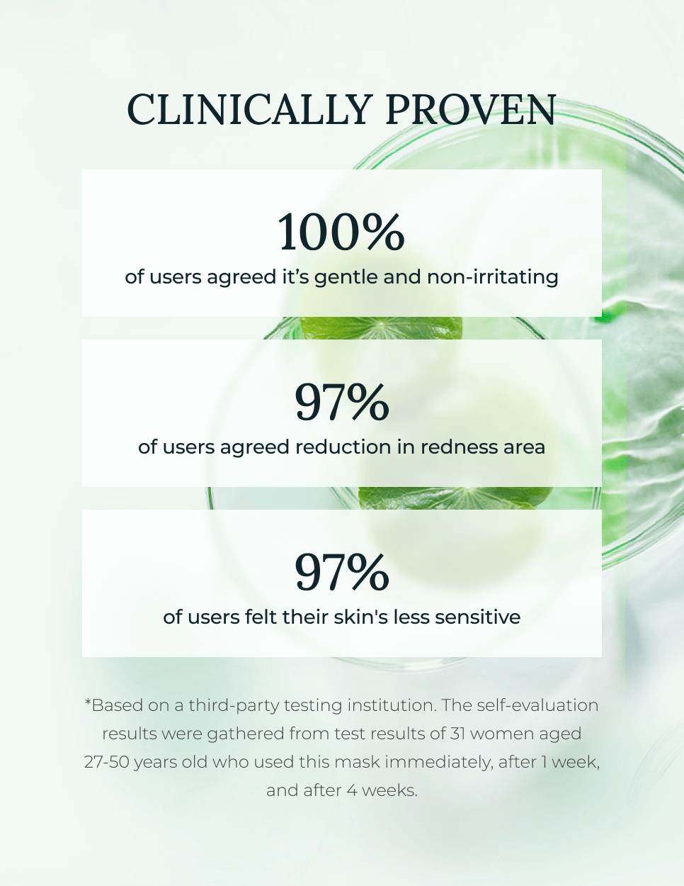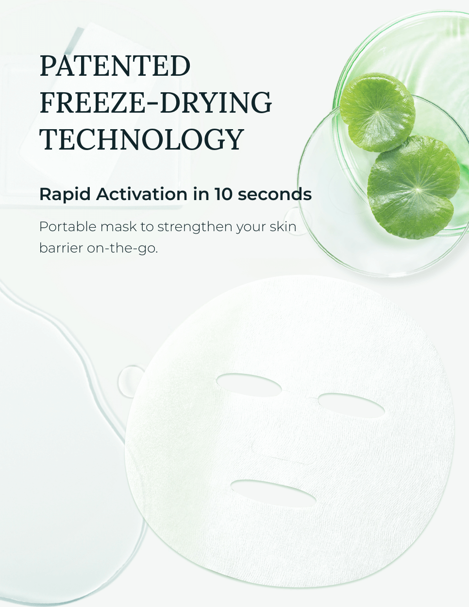 Experience the power of fast-dissolving Centella Asiatica with our patented freeze-drying technology, designed to activate in just 10 seconds. This innovative mask significantly reduces skin redness by 25.45% while boosting moisture levels by 28.48%, with an improved irritation tolerance of 15.2% after 4 weeks. The Centella Asiatica repairs the skin barrier with a proven 57.74% repair rate, while Purslane soothes and reduces redness. For deep hydration, Himalayan Tremella Polysaccharide locks in moisture and fights dryness. The mask's lightweight, breathable, and S-patterned design ensures a comfortable fit, making it the perfect solution for irritated and sensitive skin.