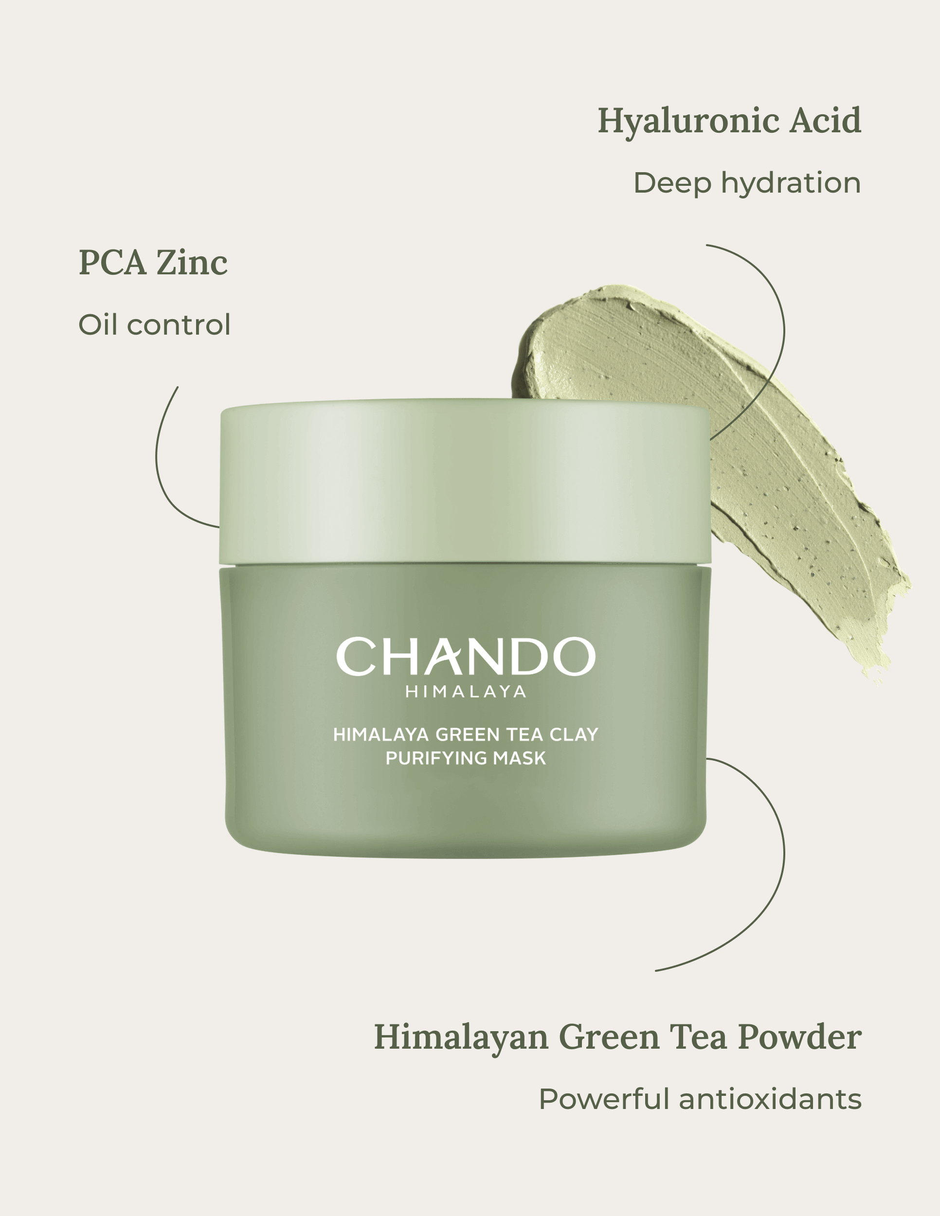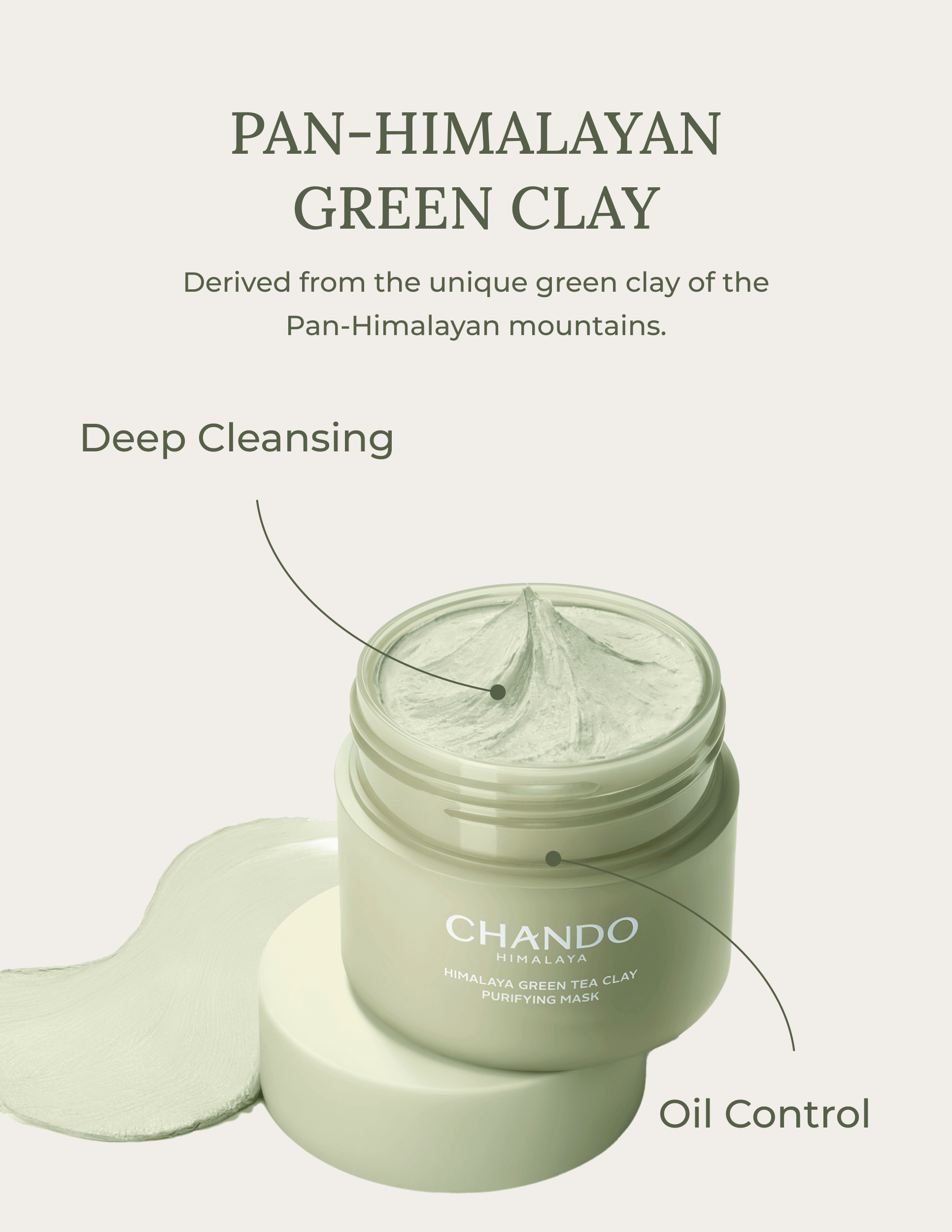 ✦Experience the purifying power of nature with CHANDO Himalaya Green Tea Clay Purifying Mask, derived from the unique natural green clay of the Himalayan mountains and infused with Chando's exclusive green tea from our tea gardens.